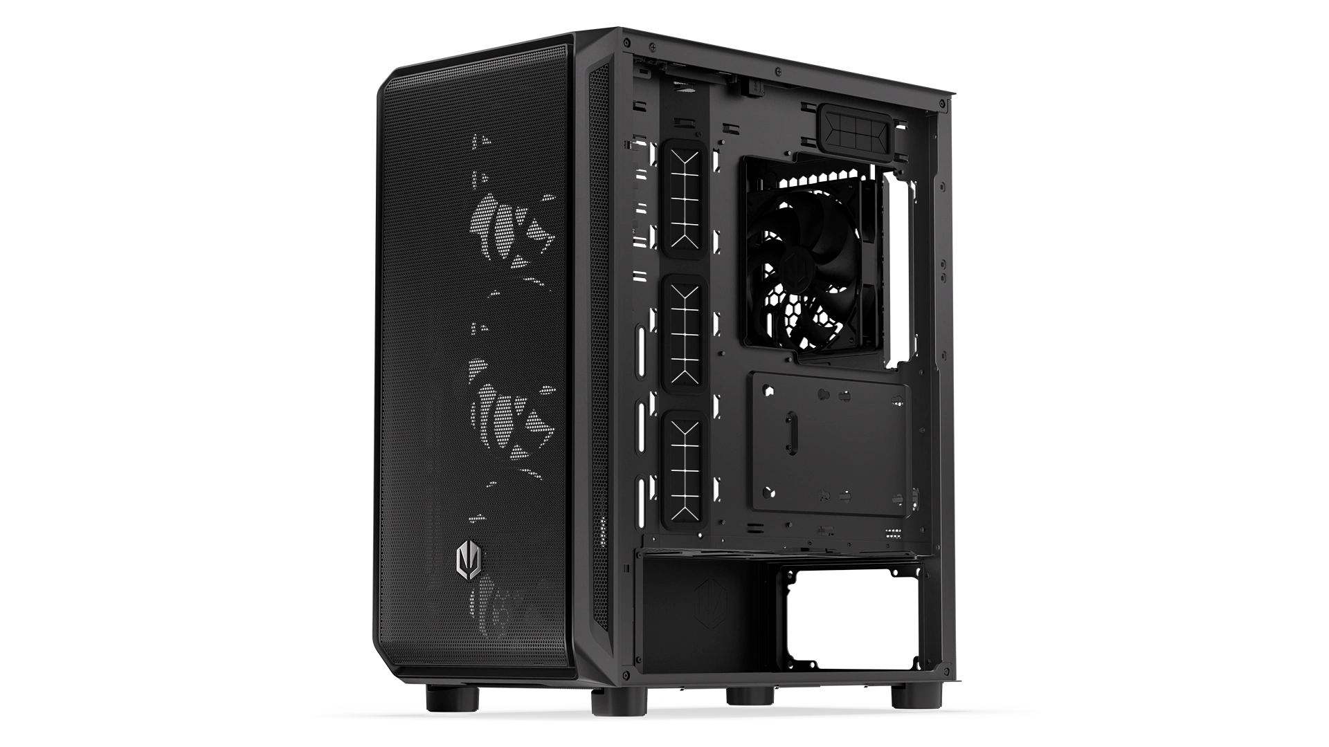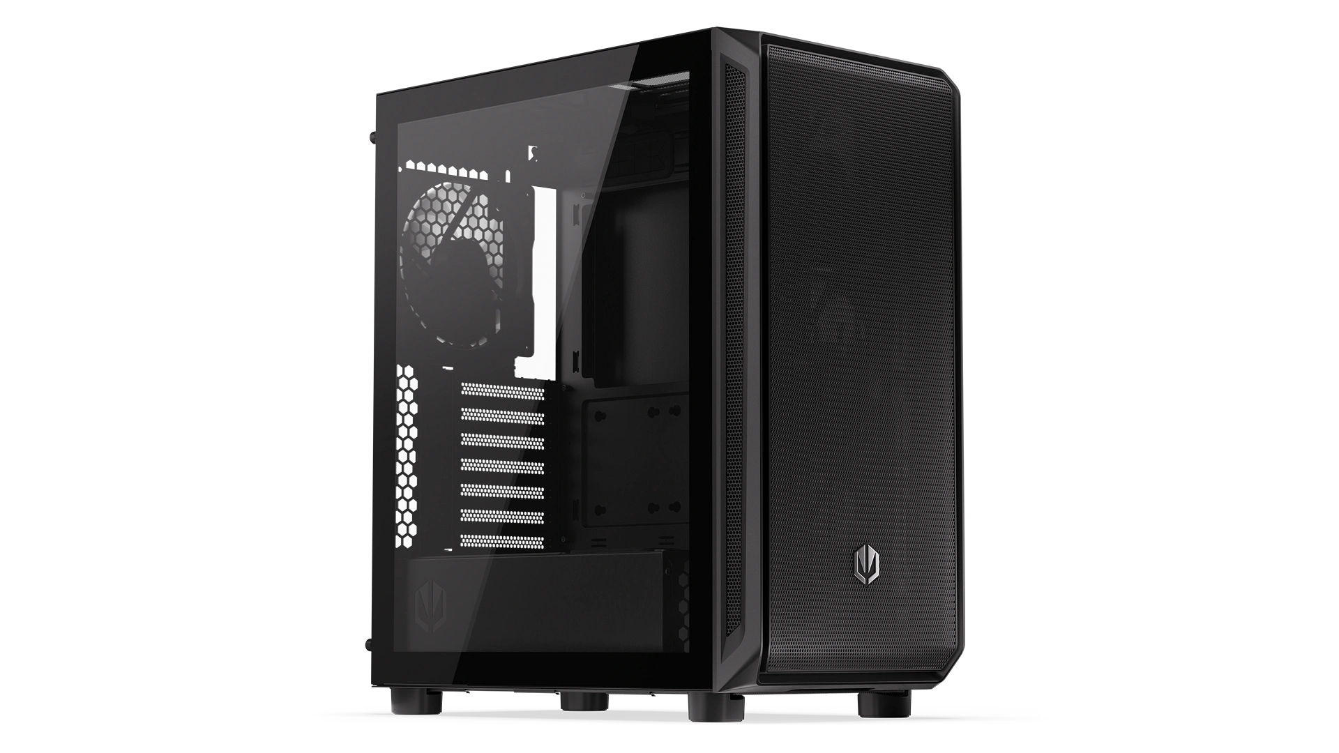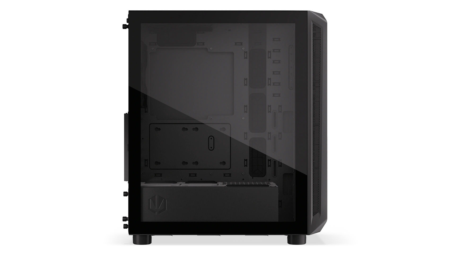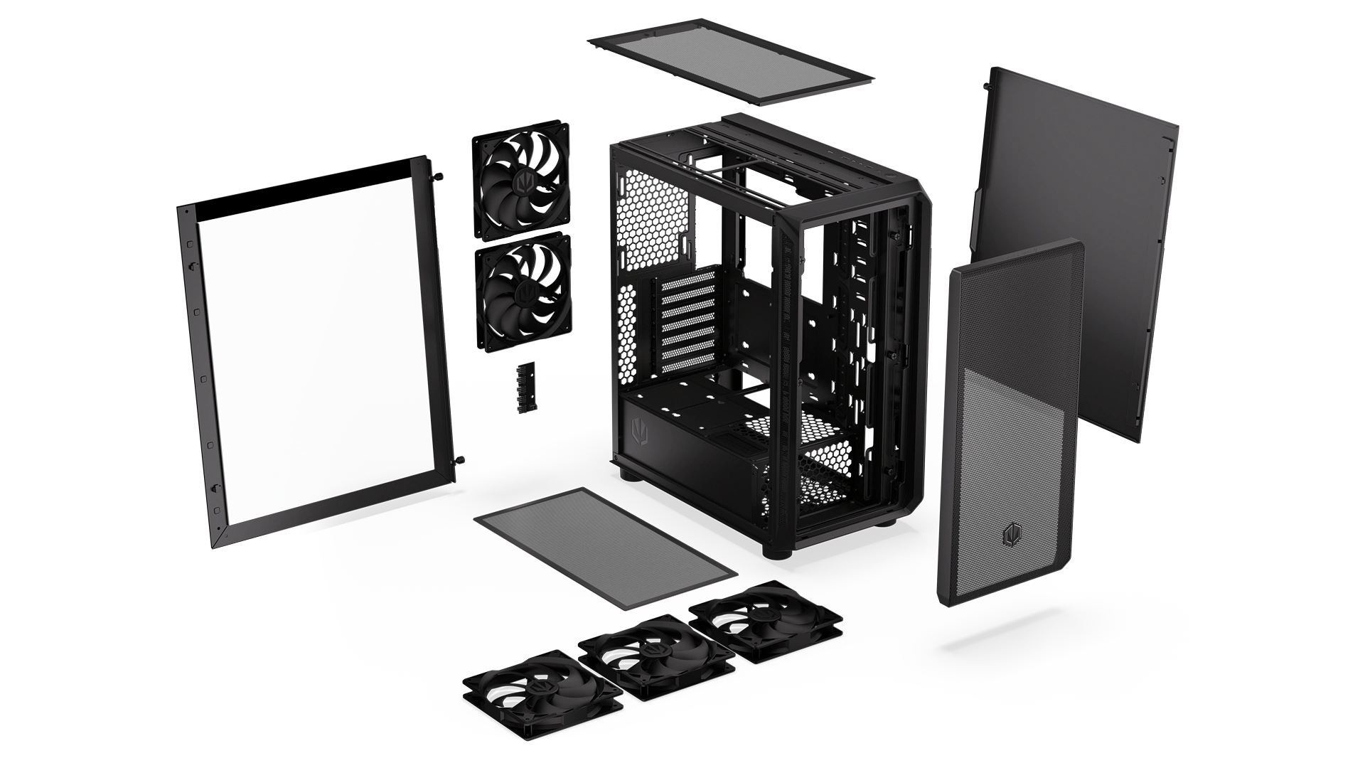 This is one of the largest cases we’ve ever created, only slightly shorter than Arx 700 series. It measures 486×228×429 mm – enough to fit a tall cooling system (up to 179 mm), 7 fans (including 5 Stratus 140 PWM that we give you for a good start), and most graphics cards available on the market (up to 350 mm long). Everything sits in a pleasant breeze, because the finely perforated front and top panels let in fresh air and block dust. You can check it out through the htempered glass window.