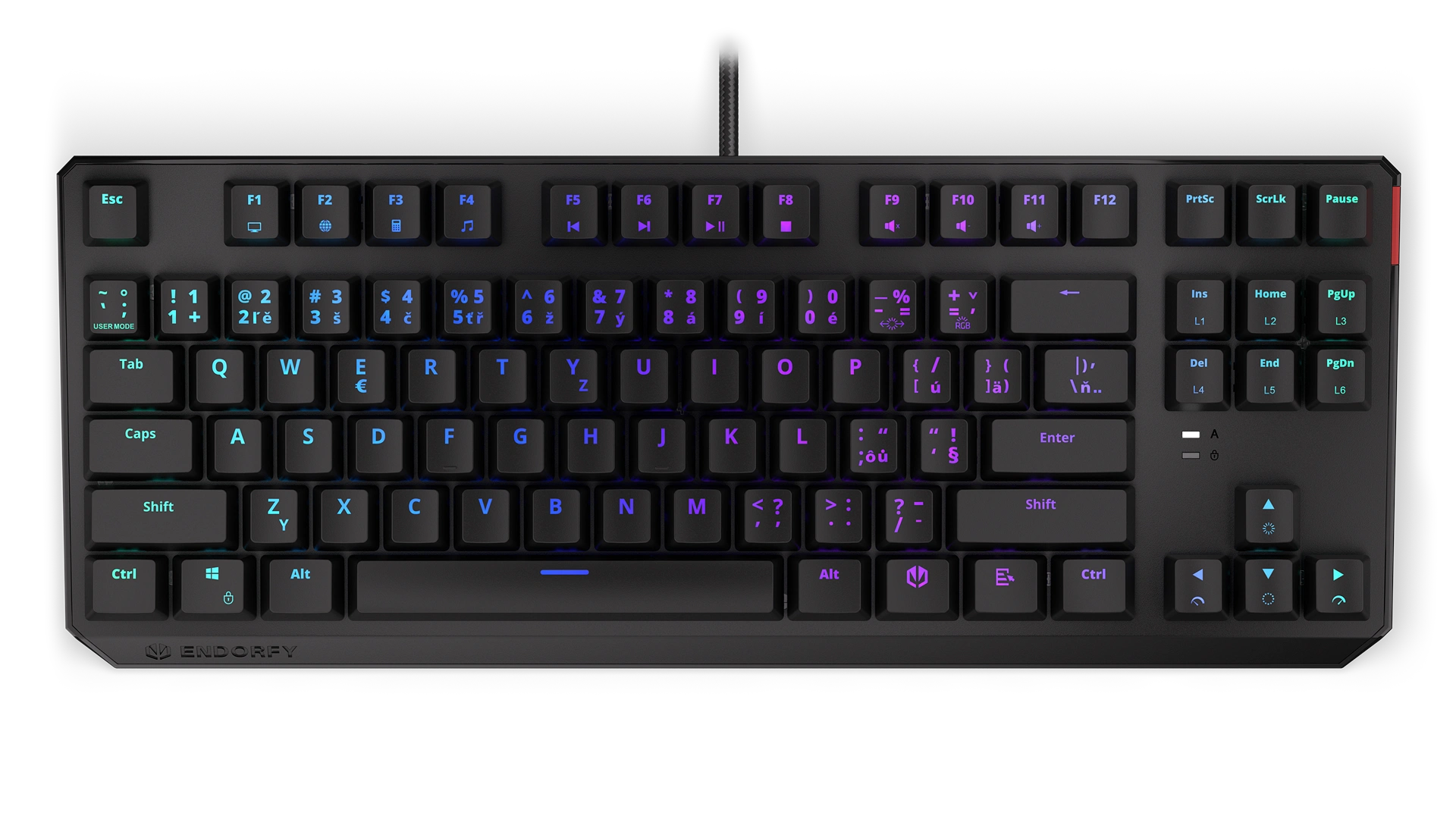 Its reinforced chassis fits 87 ultra-fast Kailh Red switches – a perfect match with FPS and multiplayer games. Each key is covered crowned with a durable ABS keycap with a Czech layout to give you that extra edge over your opponents. Say goodbye to fingers slipping off keys in the crucial moments of a game!
