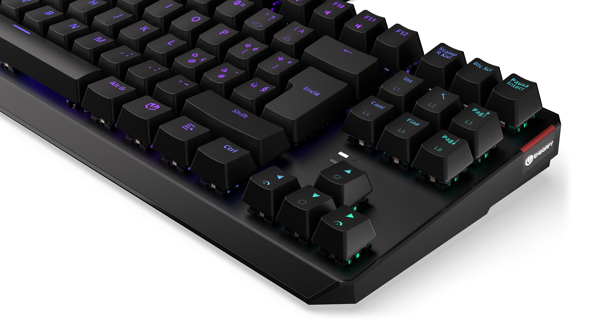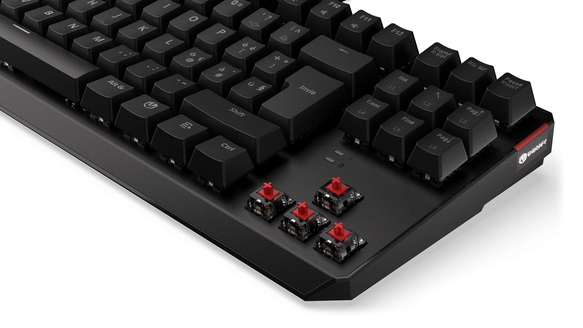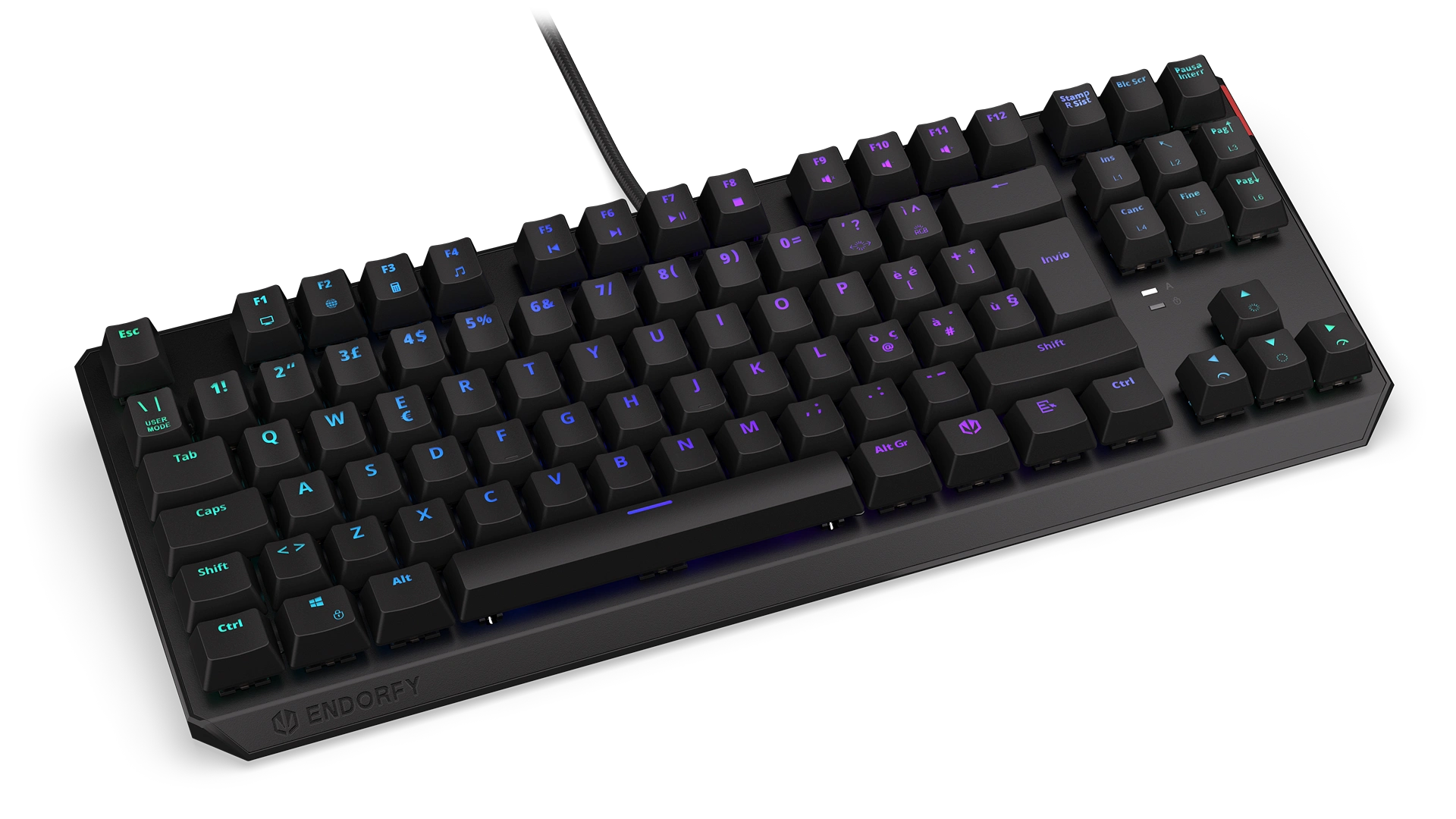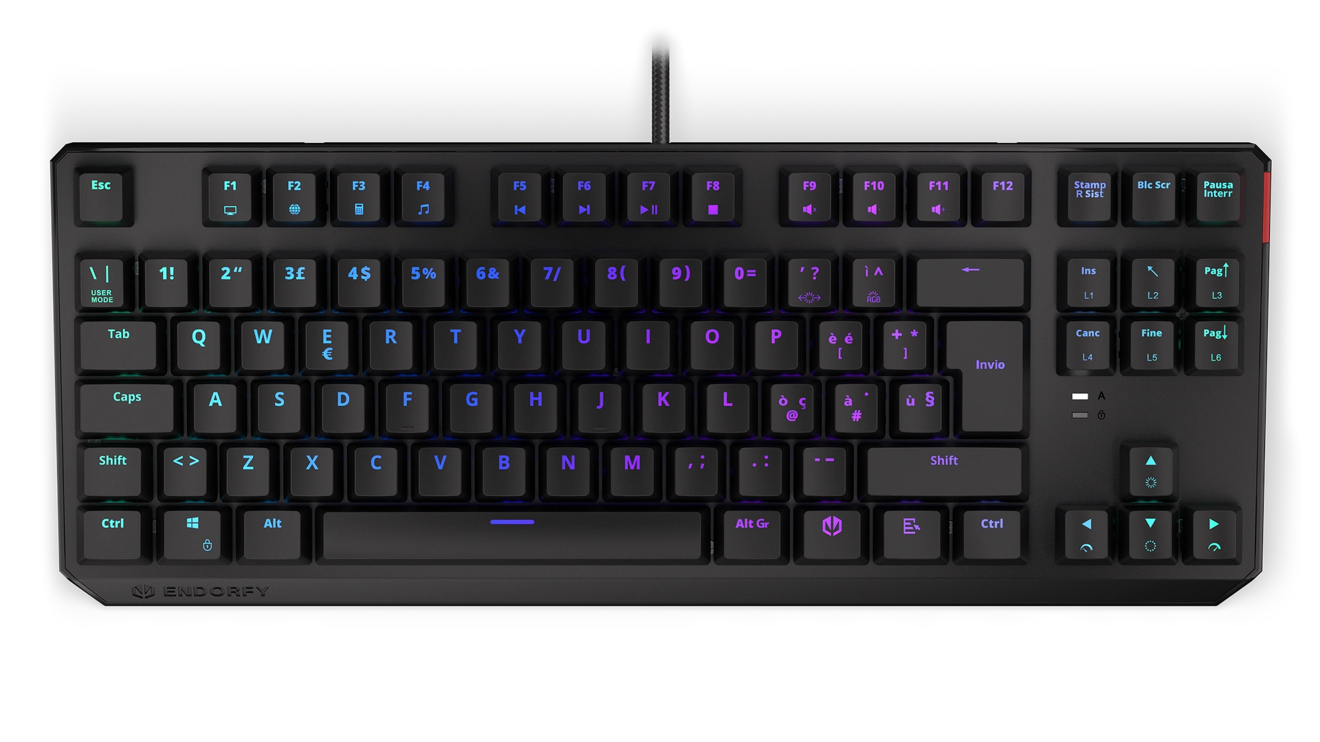 Its reinforced chassis fits 87 ultra-fast Kailh Red switches — a perfect match with FPS and multiplayer games. Each key is covered crowned with a durable ABS keycap with an Italian layout. Such a shield gives you a secure finger position, so you don't have to worry about slipping off a key in a crucial moment of virtual battle. Or in the middle of a call with your boss (if you know, you know).