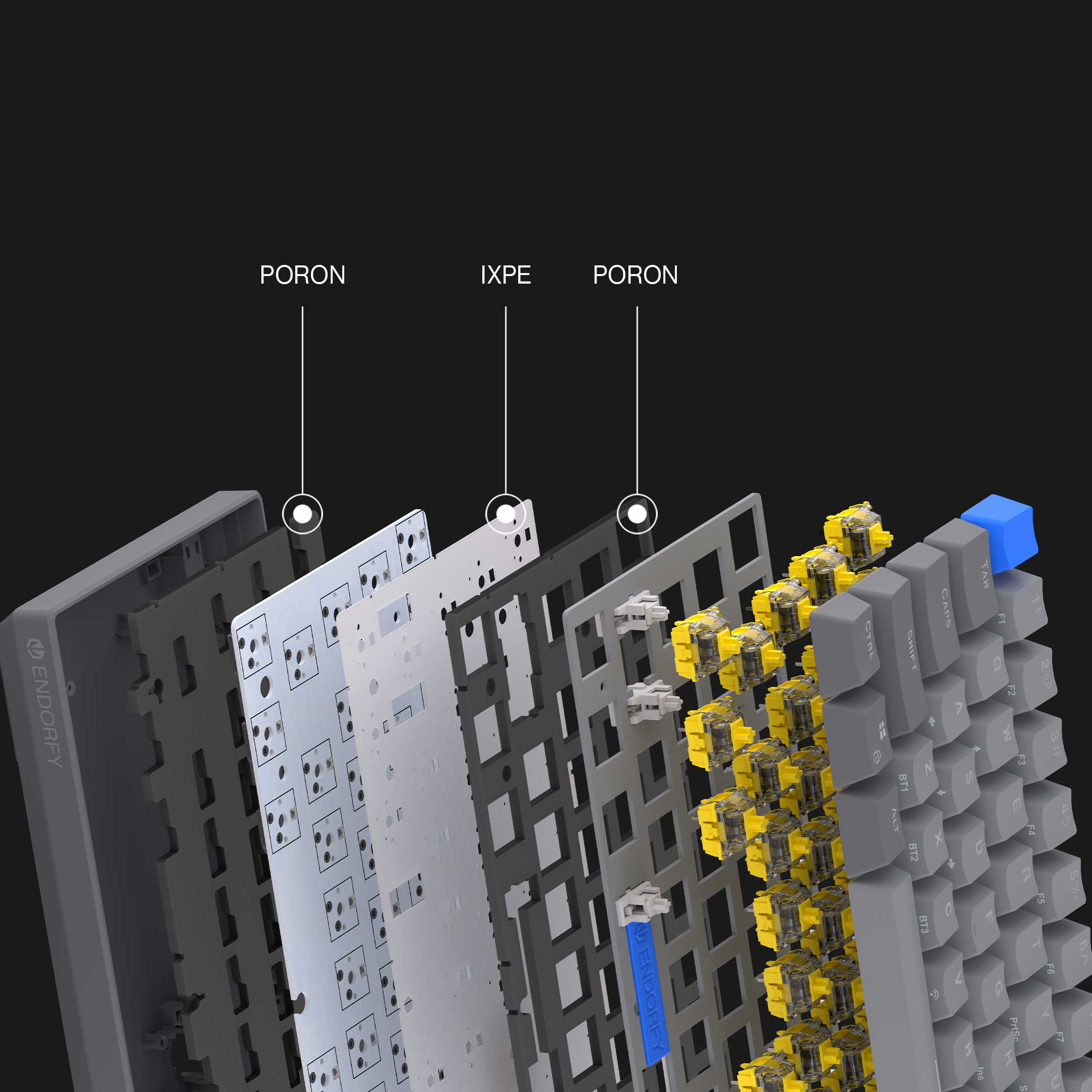 - Three layers of foam (two PORON and one IXPE) to eliminate vibrations and improve acoustics