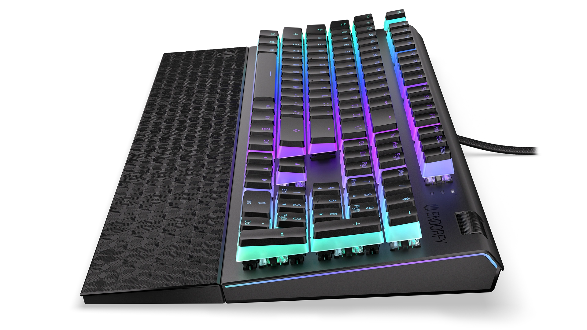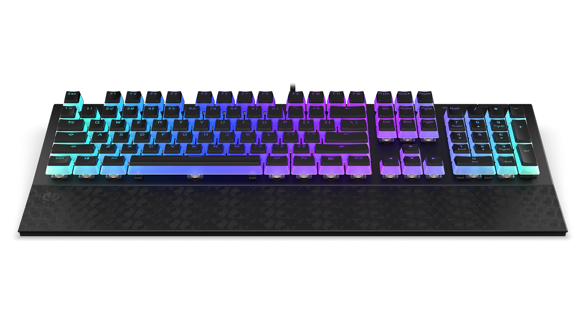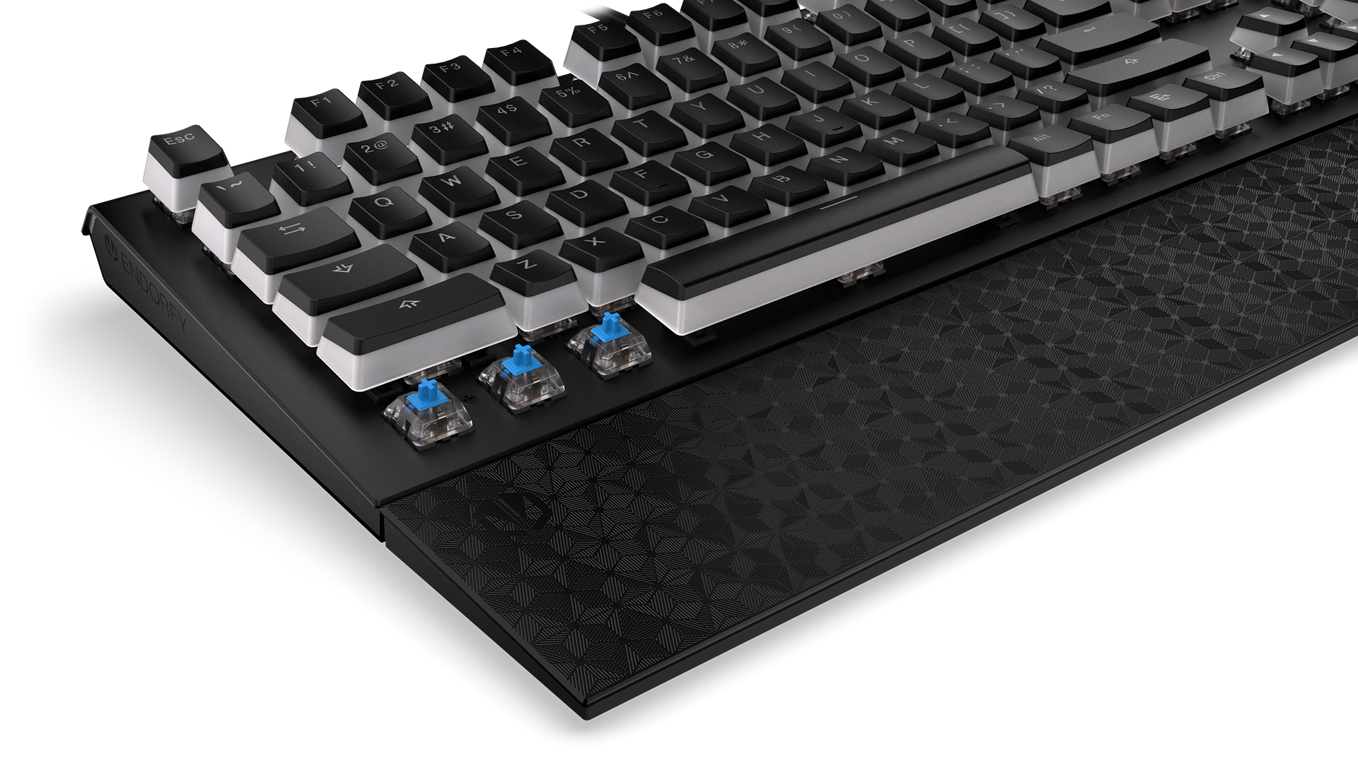 Na wzmocnionej obudowie masz 104 puddingowe przyciski PBT z podświetleniem ARGB. Jeśli się im przyjrzysz, to zauważysz, że pod nimi chowają się przełączniki mechaniczne Kailh Blue. To switche, z którymi możesz mieć pewność, że każda Twoja komenda została aktywowana – dadzą Ci o tym znać charakterystycznym kliknięciem. Dla większej wygody masz też do dyspozycji mięciutką poduszkę magnetyczną podpórkę na nadgarstki i rolkę do regulacji głośności.