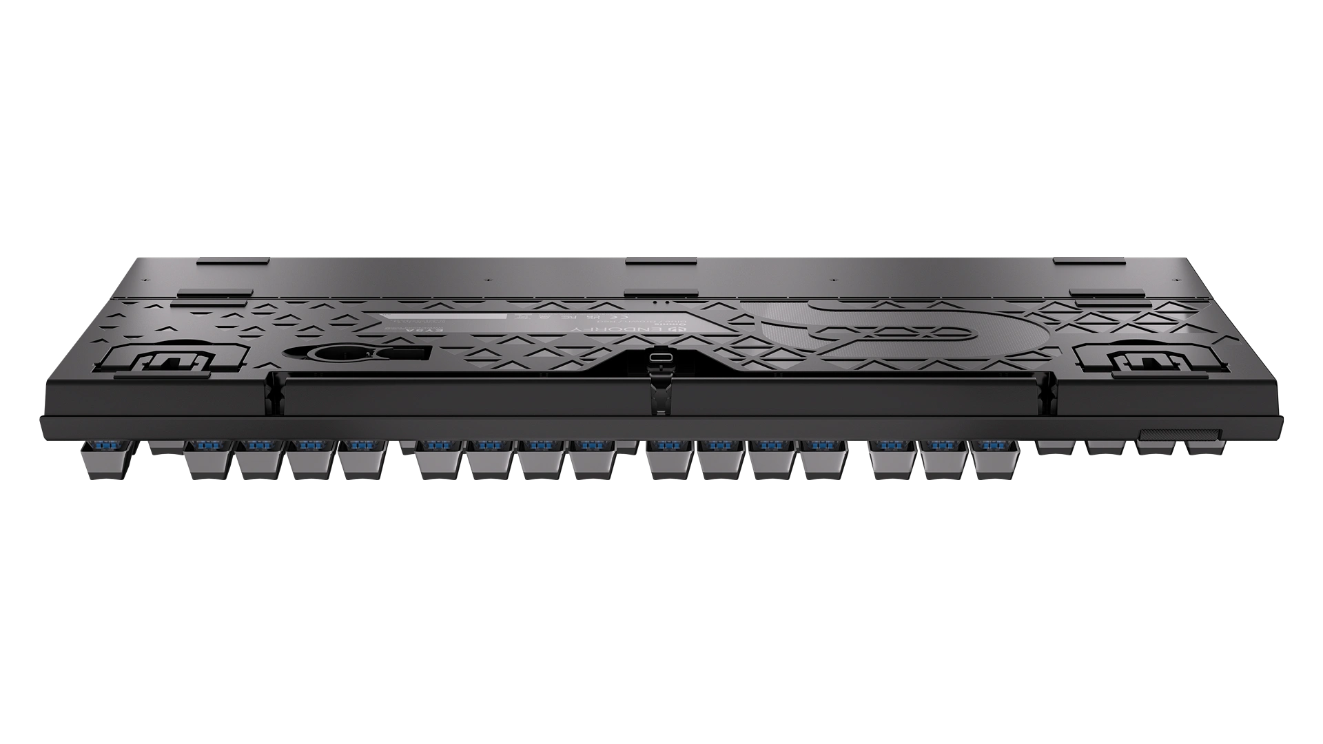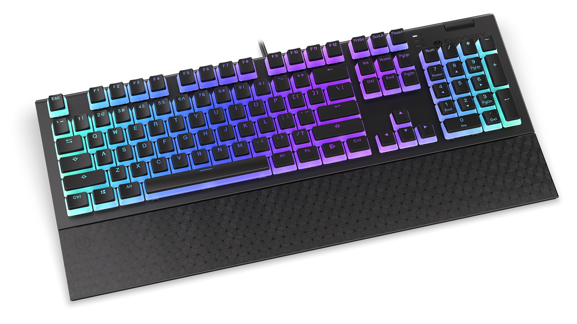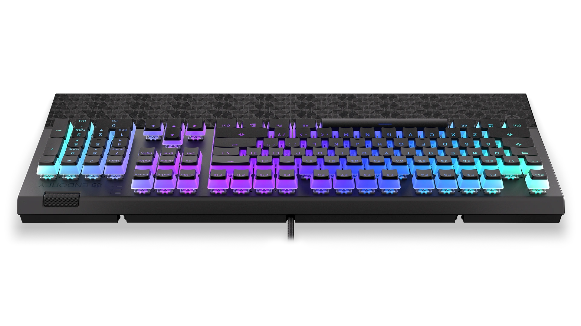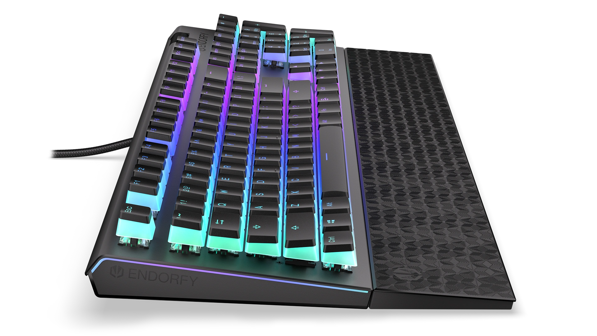 Na wzmocnionej obudowie masz 104 puddingowe przyciski PBT z podświetleniem ARGB. Jeśli się im przyjrzysz, to zauważysz, że pod nimi chowają się przełączniki mechaniczne Kailh Blue. To switche, z którymi możesz mieć pewność, że każda Twoja komenda została aktywowana – dadzą Ci o tym znać charakterystycznym kliknięciem. Dla większej wygody masz też do dyspozycji mięciutką poduszkę magnetyczną podpórkę na nadgarstki i rolkę do regulacji głośności.